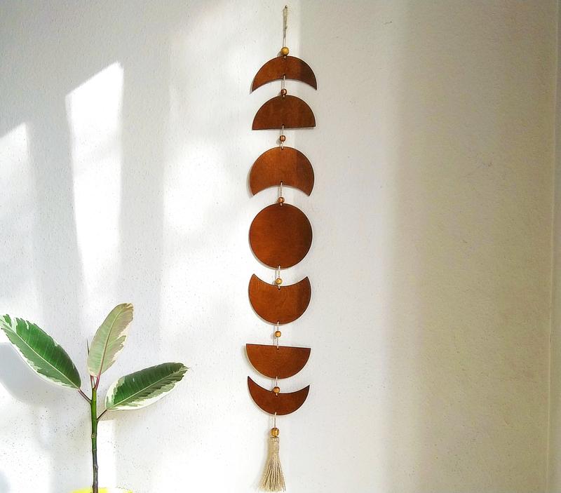 Дерев'яна підвіска на стіну фази місяця колір темний горіх, вертикальна настінна гірлянда...