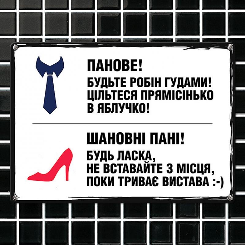Табличка интерьерная металлическая Панове! Шановні пані! - Станет неотъемлемой частью интерьера Вашего дома, ресторана, офиса. Изготовлена табличка из металла с покрытием и полноцветным изображением. По углам табличка скруглена, края загнуты, чтоб табличка выглядела объемнее. Отверстия для крепления таблички расположены по углам. Табличка устойчива к влаге и ультрафиолету! Изготовление таблички 2-3 рабочих дня! Характеристики: Материал: металл Размер: 26х18,5см Цвет: белый Печать: сублимация Крепление: гвоздики, двухсторонний скотч, веревка Комплектация: табличка Упаковка: крафтовый конверт Страна-производитель: Украина
