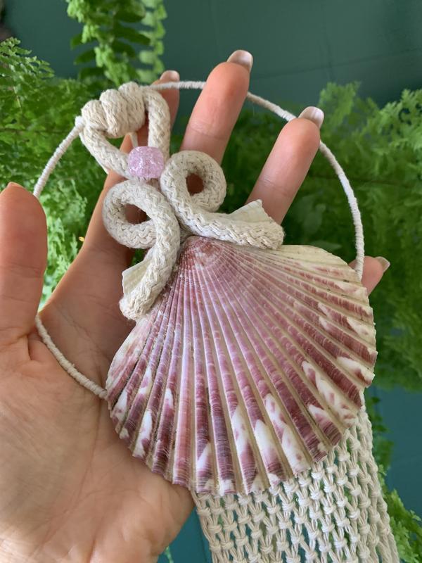 Уютный декор ручной работы в технике макраме из хлопковой нити с натуральными морскими ракушками из Атлантического побережья. Диаметр 12 см, общая длина 40 см. В центре большая 8,5 х 9,5 см) ракушка Гребешок. Натуральные ракушки не подвергались покраске, шлифовке. На ветру ракушки приятно шелестят. Находится не в Украине, поэтому перед заказом, пожалуйста, пишите. Доставка займет время. Этот декор из натуральных и природных материалов поможет придать атмосферу тепла и уюта вашему интерьеру!