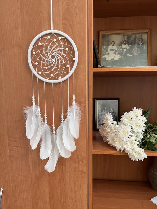 Цей білий ловець снів ручної роботи є вишуканим додатком до будь-якого інтер′єру. Виготовлений з якісних матеріалів та виконаний з любов′ю до деталей, цей бохо ловець снів створений, щоб дарувати вам спокій і захист від негативної енергії. Його вишуканий дизайн з білими та кришталевими намистинами з білим пір′ям подарує вашій спальні атмосферу мрій та гармонії. Цей ловець снів є чудовим подарунком для неї, і буде нагадувати про захист та красу природи. Розмір:діаметр основи 18 см, довжина - 40 см . Додайте цей білий ловець снів до свого простору, щоб забезпечити собі спокій та гармонію в кожній деталі вашого інтер′єру.