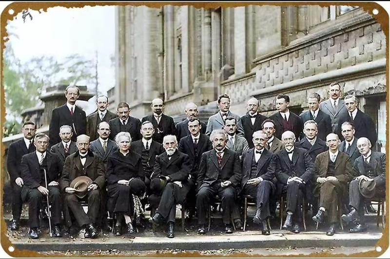 Унікальна металева табличка (14х20 см) з легендарною фотографією П'ятого Сільвеївського розпочато 1927 року — зборів найбільших умів фізики. Сюжет: Історичний кольоровий знімок, на якому є 29 провідних вчених, включно з Альбертом Ейнштейном,prією Кюрі (єдина жінка), Нільса Бора, Вернером Гейзенберга та багатьох інших. Стиль: Ретро-фотографія, стилізована під вінтажну металеву табличку. Ідеальний декор для кабінету, офісу, бібліотеки або в подарунок викладальнику/ученій. Матеріал: Міцна жість із глянсовим покриттям. Високоякісний друк, стійкий до вицвітання. Кріплення: Табличка має готові отвори в кутах для простого та надійного монтажу. Доторкніться до історії науки!