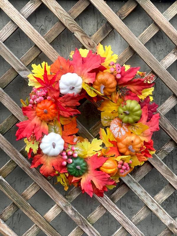 Красивий осінній вінок з гарбузами виконано на повноцінній основі з сухої трави, Є петля для підвішування. Діаметр вінка 35 см