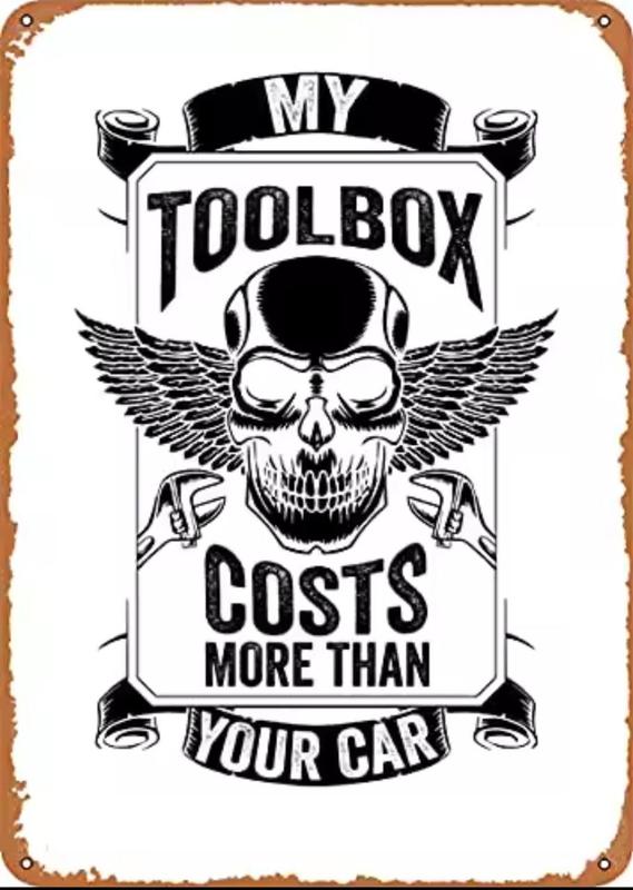 Брутальний чорно-білий постер із зображенням черепа з крилами, гайковими ключами та зухвалим написом англійською мовою: "MY TOOLBOX COSTS MORE THAN YOUR CAR" (Мій ящик з інструментами коштує дорожче за твою машину). Стиль: Ідеально підходить для декору гаража, автомайстерні, СТО, чоловічого кабінету або лофта. Чудовий подарунок для механіків, автолюбів, мотоциклістів і всіх, хто цінує свої інструменти. Матеріал: Міцна металева пластина з імітацією іржавих, зістарених країв, що додає брутальності та вінтажного шарму. Розмір: Компактний формат 14×20 см. Використання: Яскравий і гумористичний акцент, що підкреслює професіоналізм і любов до техніки. Легко кріпиться. Особливості: Контрастний принт, стійкий до вицвітання. Підкресліть свій статус у гаражі з цим дотепним постером!