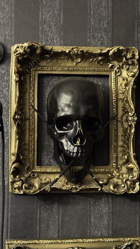 Стильный настенный арт-объект - черный череп в роскошной золоченой раме. Необычный и эффектный элемент декора, идеально дополнит интерьер в стиле лофт, готика или арт-деко. Подойдет для креативного пространства, бара или домашней студии. Уникальная вещь для тех, кто любит современное искусство с характером.
