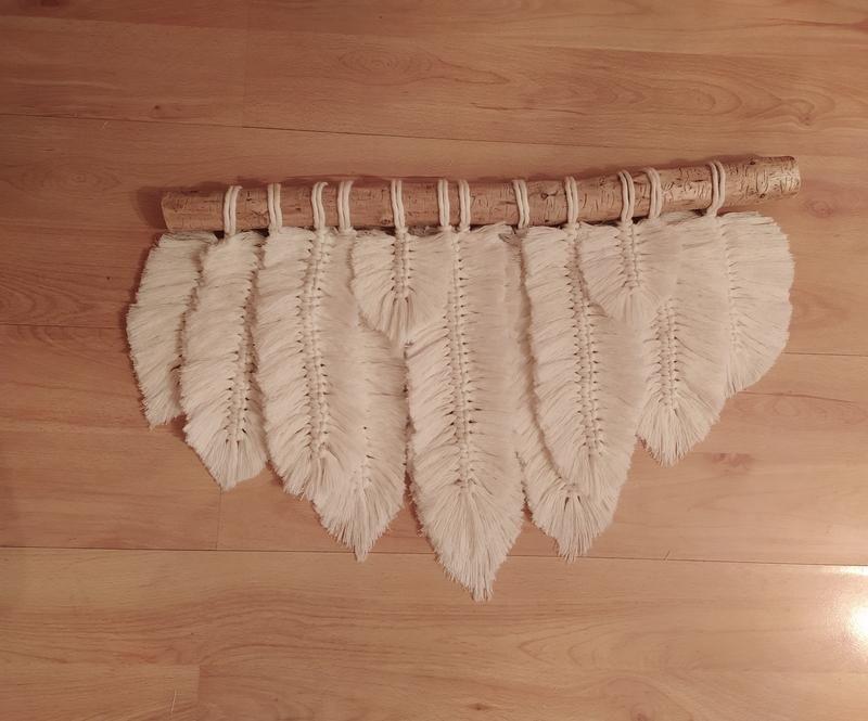 Панно "Пір'ячка" виконано у техніці макраме з бавовняного шнура та деревини.