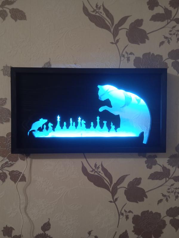 Картина "кіт, миша і шахи" з дерева і підсвіткою на пульту