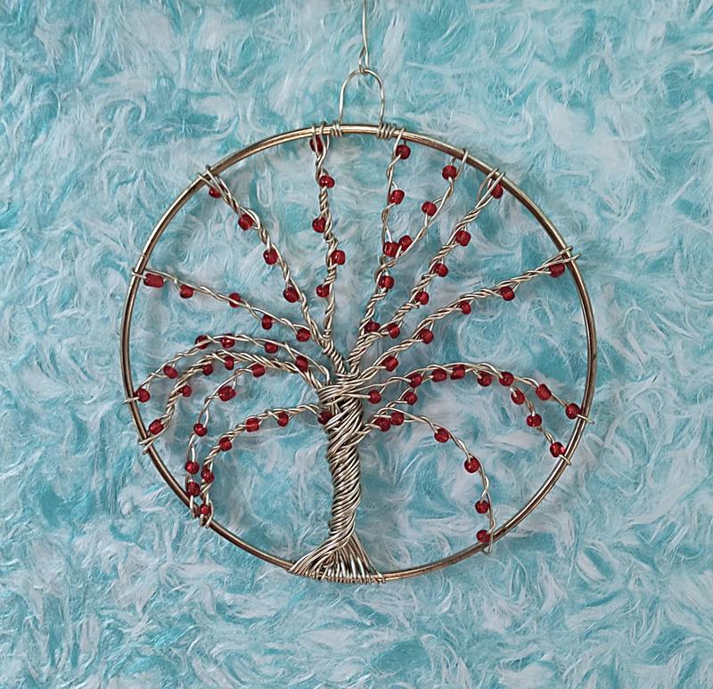 Панно ручної роботи на металевому обідку з проволоки та бусин — «Дерево життя». Декоративне дерево життя, сплетене з мідного дроту й оздоблене червоними намистинами, уособлює силу роду, життєву енергію та гармонію між минулим, теперішнім і майбутнім; воно стане яскравим акцентом в інтер’єрі та оберегом, що приносить тепло й захист у дім. Діаметр — 14 см.