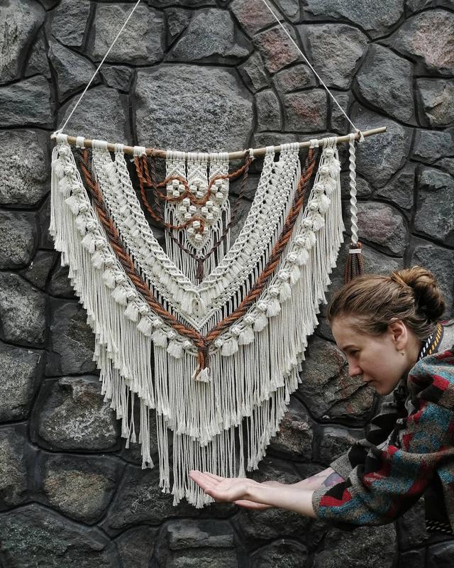 Панно, яке встигло поподорожувати зі мною. Благородний природний колір на гілочці з лісу. Розпушена бахрома надає м'яка ягкості виробу, а кольорові акценті надають родзинки. Центральний кольоровий елемент виконаний асиметрично як ода прекрасності асиметрії у природі. І кольоровий помпон, який схожий на дзвінок із одного мультика) Довжина гілочки - 93см, довжина самого виробу від гілочки до найдовшої бахроми - 97см.