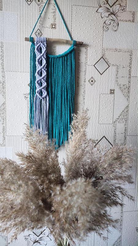 Вишукана малятко макраме в стилі бохо!😍 На цей раз нова колірна гамма - бірюза і лаванда💚💜 Природне поєднання яке нагадує гілочки бузку 💐🌿 Панно в бірюзовому кольорі чудово доповнить і прикрасить собою дитячу, вітальню, спальню або навіть робочий кабінет🖥️✍️ Колір бірюзи, який є практично універсальним, здатний заспокоїти та зняти втому, також подарує відчуття свіжості і безтурботності☺️😊💆 Розмір без петлі: 18*45 см Ціна: 400 грн В наявності!