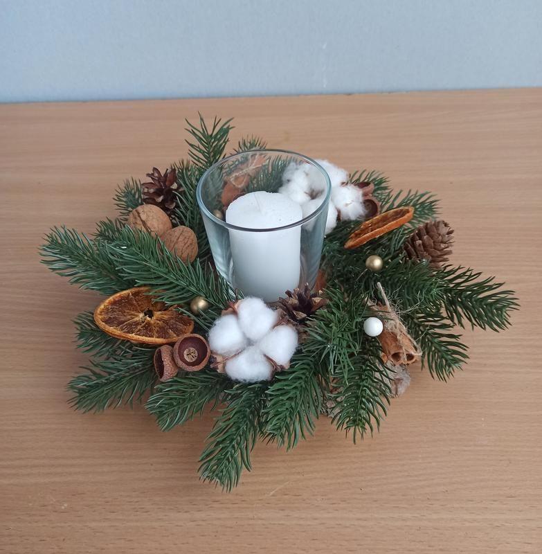 Вітаю!. Пропоную Вам нюдову з білим і дуже пряну різдвяну та і новорічну композицію на стіл. Різдвяна свічка до свята. Дуже гарно поєднані всі теплі елементи декору: бавовна, кориця, горіхи, шишки та сушені апельсини Зроблена окрім того на зрізі дерева 15 см. Зі штучною ялинкою має 20-21 см Свічка білого кольору в прозорій склянці. Дуже зручно, бо Ви завжди її можете поміняти Додаткові характеристики: Матеріал: Дерево