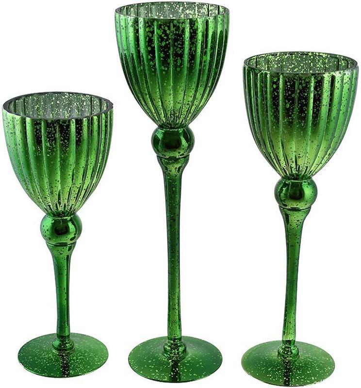 Підсвічники скляні Catherine виготовлені у формі кольорових келихів. Матеріал — скло. Колір зовнішній — різдвяний зелений. У наборі 3 свічники заввишки 30 см (Ø13 см), 35 см (Ø13 см) і 40 см (Ø13 см). Підсвічники упаковані в подарункову безпечну коробку з пінопластом.