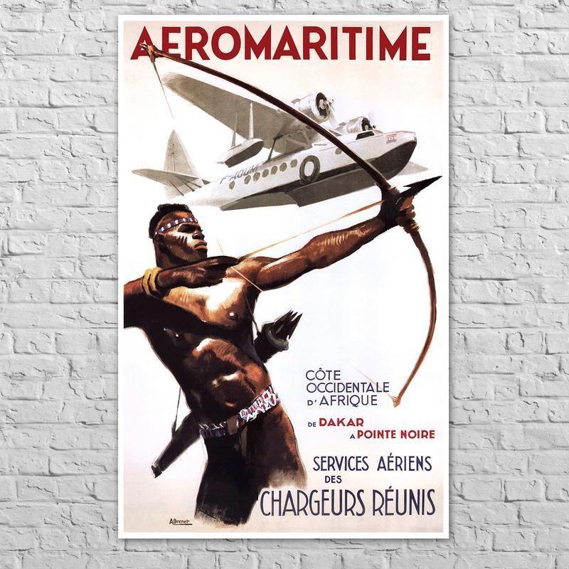Репродукція рекламного постера 1935 року французької авіакомпанії. Постер рекламує повітряні перевезення на західне узбережжя Африки. Літак зображений на плакаті це американський Sikorsky S-43 Амфібія. Автор ілюстрації французький художник Альбер Брене. Розмір плакату А1, 84х53 см.