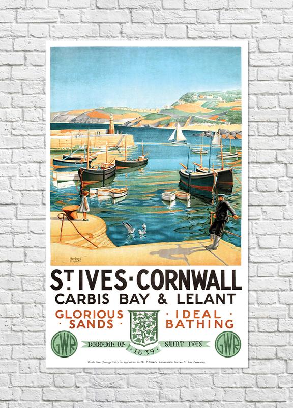 Рекламный постер 1930-х от британской компании Great Western Railway. Реклама путешествий до городка Сент-Айвз в графстве Корнуолл. В прошлом это был просто рыбацкий поселок, а назван так в честь святой Ии Корневільської, принцессы, святой мученицы. Автор иллюстрации — Herbert Truman. Художник работал в ряде стилей, получив признание за его оригинальность и универсальность. Его любимые предметы гавань и старинные дома Сент-Айвз. Размер плаката 52х84 см.