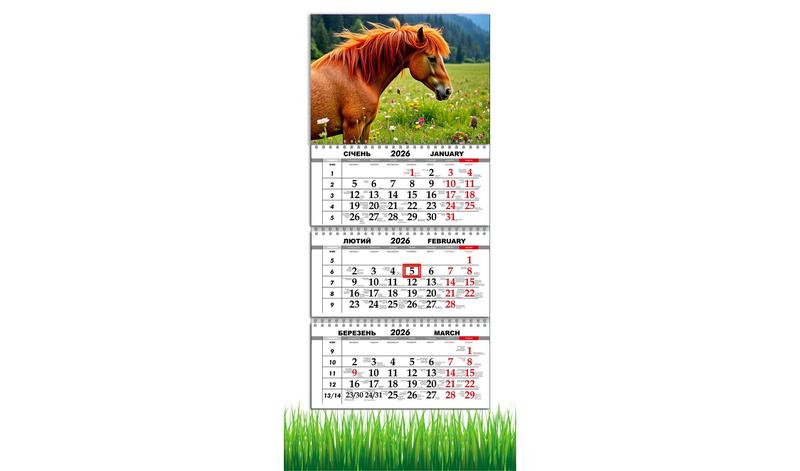 Календар настінний квартальний на 2026 рік на три пружини , apriori, рік коня, кінь, симво...