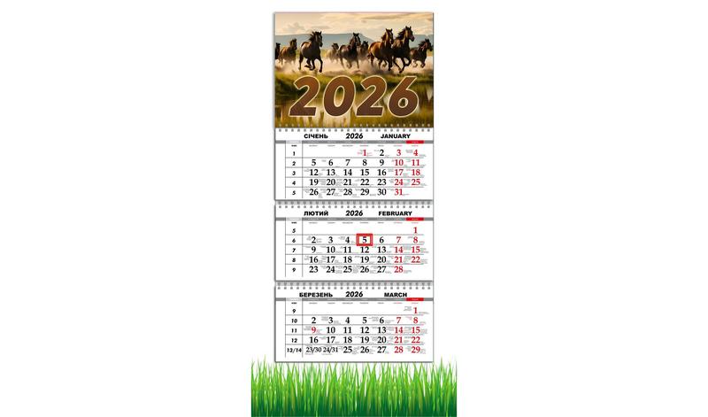 Календар настінний квартальний на 2026 рік на три пружини , apriori, рік коня, кінь, симво...