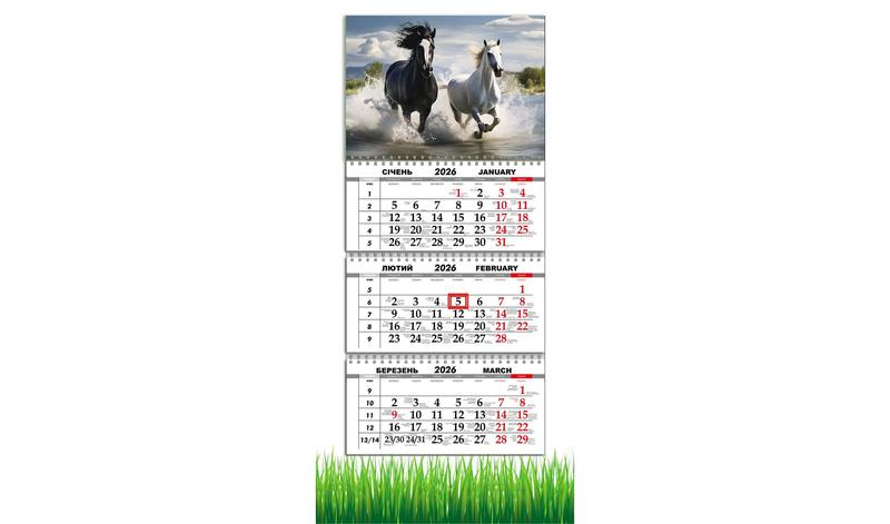 Календар настінний квартальний на 2026 рік на три пружини , apriori, рік коня, кінь, симво...