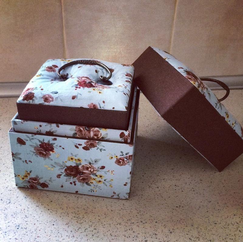 Інтер'єрні шкатулки квадратної форми виготовлені у техніці тканевого картонажу. Декор для спальні чи вітальні. Колір голубий та шоколад.