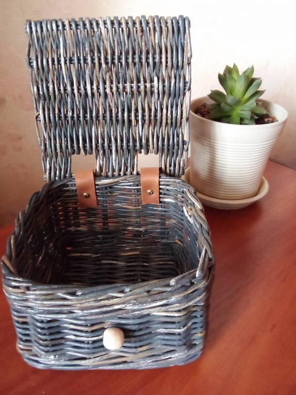 Плетена корзина з кришкою. Кришка тримається на кожаних ремінцях з вінтами. Корзина міцна, вологостійка. Розміри Ш/Д/В 17/17/11 см
