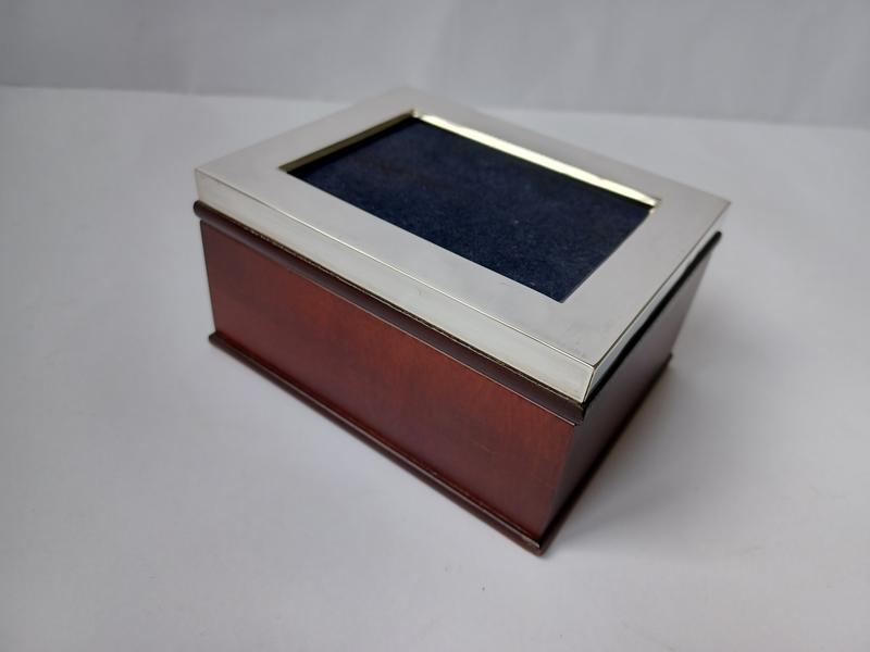 Практично ідеальний стан. Корпус дерево. Верхня кришка має вставку яка знімається і є можливість вставити фото. Рамка верхньої кришки срібло 925 проби. Розмір шкатулки 11,5х9х6 см. Цікавий подарунок.