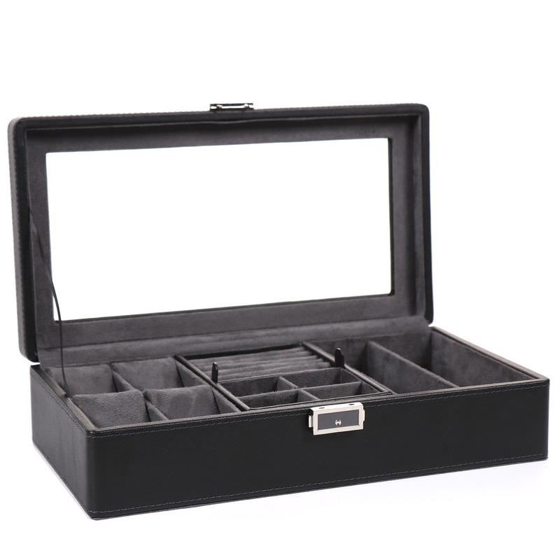 Скринька для нерухомого зберігання 4-х годинників, 2-х пар окуляр та прикрас. Матеріал корпусу - PU шкіра. Колір - чорний. Інтер'єр - темний оксамит. Виробник - компанія Salvadore, Австрія. Розмір: 36*19*9 см