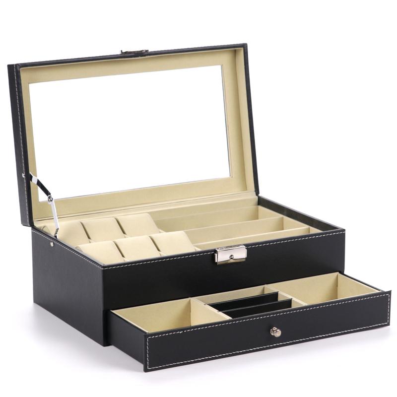 Скринька для зберігання 6-ти годинників, 3-х окулярів та прикрас Матеріал корпусами - PU шкіра. Колір - чорний. Інтер'єр - світлий бархат. Виробник - компанія Craft, Тайвань.