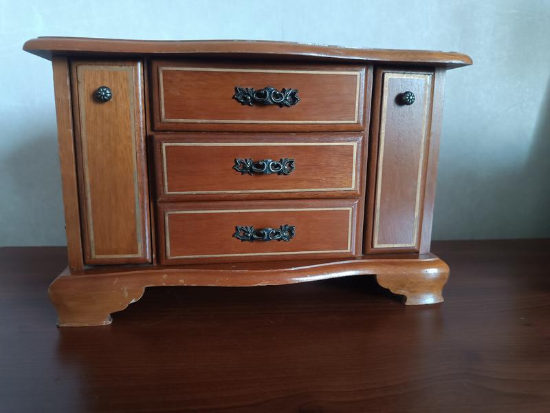 Скринька для прикрас, дерево, вінтаж, розмір: 29×18,7×15, --- 🪞Музична скринька для прикрас з антикварним шармом Вишукана дерев’яна скринька для коштовностей, виконана в класичному стилі з теплим червоно-коричневим відтінком полірованої деревини. Центральна частина містить три місткі шухляди з декоративними металевими ручками, а бокові секції відкриваються як дверцята, приховуючи м’які жовті валики — ідеальні для зберігання каблучок, сережок чи дрібних аксесуарів. 🔸 Особливість: всередині вмонтований механізм музичної шкатулки — при відкритті лунає ніжна мелодія, що додає виробу особливого шарму та ностальгії. Видимий механізм з циліндром і гребенем демонструє тонку майстерність виготовлення. 🔸 Розміри: компактна, ідеально пасує для туалетного столика або вітрини. 🔸 Стан: чудовий, без пошкоджень, механізм працює справно. 🔸 Походження: ймовірно, виготовлена в середині XX століття, можливо в Англії або Німеччині — характерні риси дизайну та якість обробки вказують на європейське виробництво.