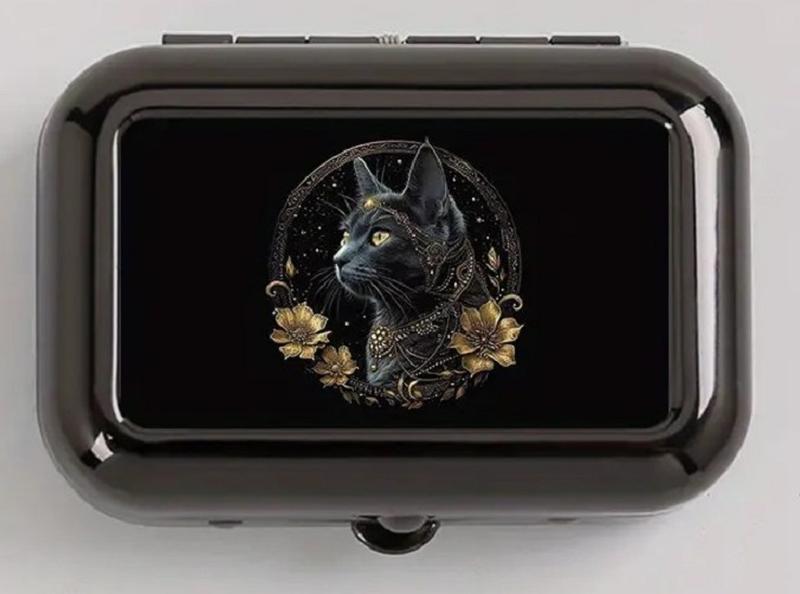 Кишенькова металева міні-попільничка чорного кольору з наліпкою"чорна кішка" на кришці..