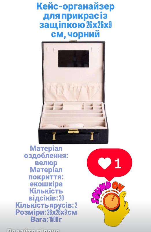 Шкатулка для украшений из эко кожи, 2 яруса – идеальный органайзер для бережного хранения ваших ювелирных изделий. Компактный и функциональный дизайн с размерами 26×26×9 см обеспечивает удобство использования и легкость хранения. Выполненная из качественной эко кожи, эта шкатулка станет стильным дополнением любого интерьера, сочетая в себе практичность и элегантность. Основные характеристики органайзера для хранения бижутерии размеры шкатулки для украшений 26×26×9 см; количество ярусов - 2 шт; количество отсеков - 20 шт; материал корпуса - экокожа; внутреннее покрытие - велюр; зеркало в комплекте. Шкатулка оборудована двумя вместительными ярусами, предлагающими 20 разнообразных отсеков. Это позволяет аккуратно разместить кольца, серьги, цепочки, браслеты и другие украшения, предотвращая их повреждения и спутывание. Внутреннее покрытие из мягкого велюра обеспечивает дополнительную защиту от царапин и повреждений. Основные преимущества шкатулки для украшений из эко кожи Экологичная кожа приятна на ощупь, долговечна и устойчива к внешним повреждениям, а велюровое покрытие внутри бережно хранит драгоценности и предотвращает появление царапин. Благодаря 20 отдельным отсекам и двум просторным ярусам, все украшения аккуратно размещены и всегда находятся под рукой. Современное исполнение и сдержанные цвета органично вписываются в любой интерьер, превращая органайзер в стильный элемент декора. Встроенное зеркало добавляет функциональности и облегчает выбор украшений. Отличное решение для подарка по любому поводу: День рождения, 8 марта, годовщина, День святого Валентина или Новый год. Дополнительным преимуществом модели является встроенное зеркало, удобное для примерки украшений и ухода за собой. Шкатулка из эко кожи отлично подходит в качестве подарка на любой праздник, а также будет полезным приобретением для личного использования. Купить шкатулку для ювелирных изделий можно с доставкой по всей Украине. Характеристики: Материал отделки: велюр Материал покрытия: экокожа Количество отсеков: 20 Количество ярусов: 2 Размеры: 26х26х9 см Вес: 1500 г Характеристики: Вес 1.5 кг Высота 9 см Гарантийный срок 14 дней Длина 26 см Материал корпуса МДФ Форма Квадратная Цвет Черный Ширина 26 см Внутреннее покрытие Велюр Количество ярусов 2 Материал покрытия Экокожа