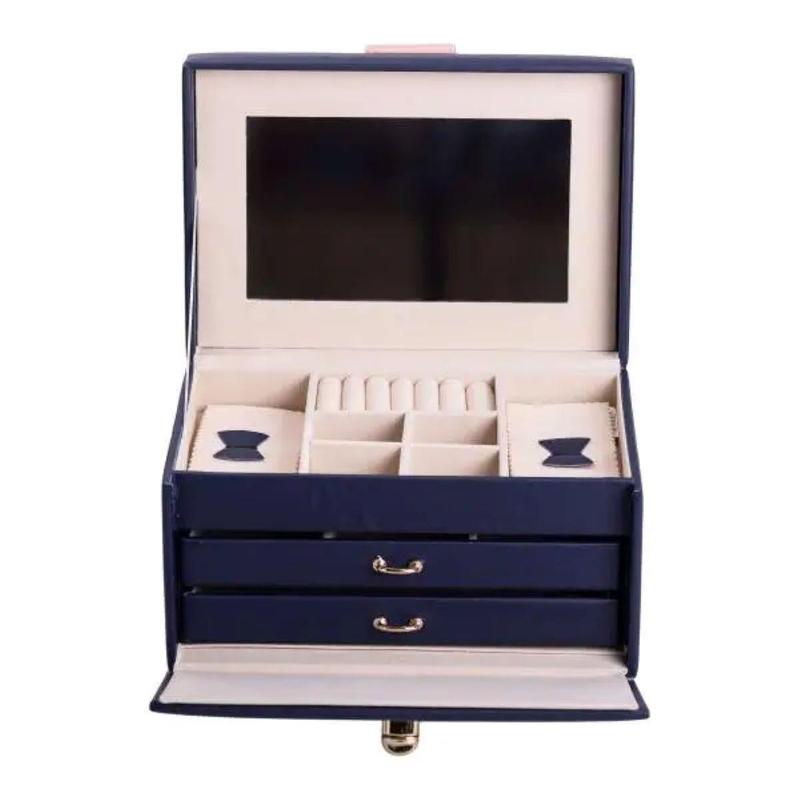 Скринька для прикрас з еко шкіри, 3 яруси - ідеальний органайзер для дбайливого зберігання ювелірних виробів. Компактний та функціональний дизайн з розмірами 22.5×15.5×13 см забезпечує зручність використання та легкість зберігання. Виконана з якісної еко шкіри, ця скринька стане стильним доповненням будь-якого інтер'єру, поєднуючи в собі практичність та елегантність, а клямка забезпечить збереження Ваших прикрас. Основні характеристики органайзера для зберігання біжутерії розміри шкатулки для прикрас 22.5×15.5×13 см; кількість ярусів - 3 шт; кількість відсіків - 13 шт; матеріал корпусу - екошкіра; внутрішнє покриття - велюр; дзеркало в комплекті. Скринька обладнана трьома місткими ярусами, що пропонують 13 різноманітних відсіків. Це дозволяє акуратно розмістити кільця, сережки, ланцюжки, браслети та інші прикраси, запобігаючи їх пошкодженню та сплутуванню. Внутрішнє покриття з м'якого велюру забезпечує додатковий захист від подряпин та пошкоджень. Основні переваги скриньки для прикрас з еко-шкіри Екологічна шкіра приємна на дотик, довговічна та стійка до зовнішніх пошкоджень, а велюрове покриття всередині дбайливо зберігає коштовності та запобігає появі подряпин. Завдяки 13 окремим відсікам та трьом просторим ярусам, всі прикраси акуратно розміщені та завжди знаходяться під рукою. Сучасне виконання та стримані кольори органічно вписуються в будь-який інтер'єр, перетворюючи органайзер на стильний елемент декору. Вбудоване дзеркало додає функціональності та полегшує вибір прикрас. Якісна клямка забезпечує збереження та захист ювелірних виробів від випадкового відкриття та втрати. Відмінне рішення для подарунка з приводу: День народження, 8 березня, річниця, День святого Валентина або Новий рік. Додатковою перевагою моделі є вбудоване дзеркало, зручне для примірки прикрас та догляду за собою. Надійна клямка гарантує безпечне зберігання ваших коштовностей, за винятком випадкового відкриття скриньки. Скринька з еко шкіри відмінно підходить як подарунок на будь-яке свято, а також буде корисним придбанням для особистого використання. Купити скриньку для ювелірних виробів можна з доставкою по всій Україні.