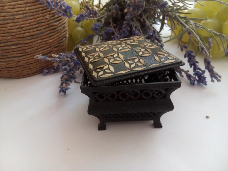 Мініатюрна скринька - скринька часів СРСР виробництва Дарницької фабрики сувенірно-подарункових виробів (Київ), 70-е роки. Цікава фабрика тим, що в свій час там випускали гідні речі, в тому числі сувенірну галантерею. Дуже мила штучка! Матеріал виробу - колки пластик. Кришка вручну інкрустована соломкою, сама скринька має витіюваті орнаментальні вставки. Мініатюра, розмір виробу: 5 х 5 х 3,5 см. Стан хороший, без дефектів. Стане чудовим подарунком як колекціонеру вінтажу, даруючи особливу чарівність минулого часу, доповнить декор туалетного столика, послужить за призначенням для зберігання прикрас, таблеток, намистин та інших дрібниць.