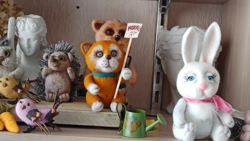 Котик виконан з вовни вручну.Висота інтер'єрноі іграшки 17 см.Має на шиї стрічку з натурального шовку та табличку "Кохаю",та у запасі має вудочку для відпочинку.