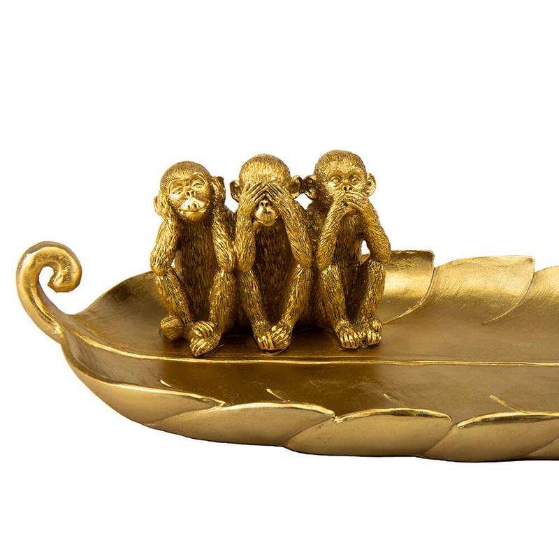 Декоративна фігурка у вигляді трьох мавп на листку - це витончена, вишукана фігура з полістоуну золотистого кольору, яка ідеально підходить для подарунка творчому характеру, друзям, колегам. Це буде чудовий сувенір у вашому будинку - на полиці, каміні, стільниці в їдальні або вітальні. Статуетка не тільки красива і порадує око, але і практична - фігурка досить широка і має багато вільного місця для зберігання дрібних, але важливих речей - прикрас, сувенірів, побутових дрібниць.