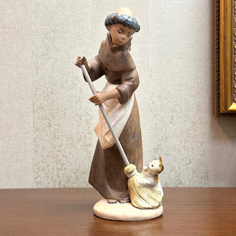 Порцелянова статуетка Lladro Gres, No 2203, оригінальна назва «Afternoon Chores (Послеопередні турботи)», в іспанському варіанті — «Fray Escoba (Монах із мітлою)». Грэс (керамогранит). Номер моделі 01012203. Клеймо Lladro. Зроблена в Іспанії в період із 1990 до 1993 рр. Ручна робота. Скульптор: Juan Huerta. Одна з 5 статуеток мінісерії «Монахи», яка містить у собі: - No 2201, «Our Daily Bread (Хліб наш оболонки нашого)»; - No 2202, «A Helping Hand (Поміщник)»; - No 2203, «Afternoon Chores (Пістеобідні турботи)»; - No 2204, «Farmyard Grace (Благодати на фермі)»; - No 2205, «Prayerful Stitch (Молітвний стібок)». Висота — 21 см. Ширина максимальна — 10 см. Стан ідеальний. Тріщин, відколів, пошкоджень немає. Оригінальної коробки, на жаль, немає.
