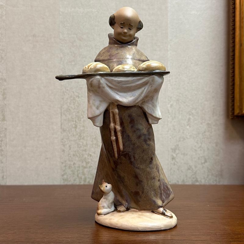 Порцелянова статуетка Lladro Gres, No 2201, оригінальна назва «Our Daily Bread (Хліб наш істотний)», в іспанському варіанті — «Fray Pan Niestro (Монах із хлібом». Грэс (керамогранит). Номер моделі 01012201. Клеймо Lladro. Зроблена в Іспанії в період із 1990 до 1994 рр. Ручна робота. Скульптор: Juan Huerta. Одна з 5 статуеток мінісерії «Монахи», яка містить у собі: - No 2201, «Our Daily Bread (Хліб наш оболонки нашого)»; - No 2202, «A Helping Hand (Поміщник)»; - No 2203, «Afternoon Chores (Післюботні турботи)»; - No 2204, «Farmyard Grace (Благодати на фермі)»; - No 2205, «Prayerful Stitch (Молітвний стібок)». Висота — 22 см. Ширина максимальна — 14 см. Стан ідеальний. Тріщин, відколів, пошкоджень немає. У Оригінальній коробці.