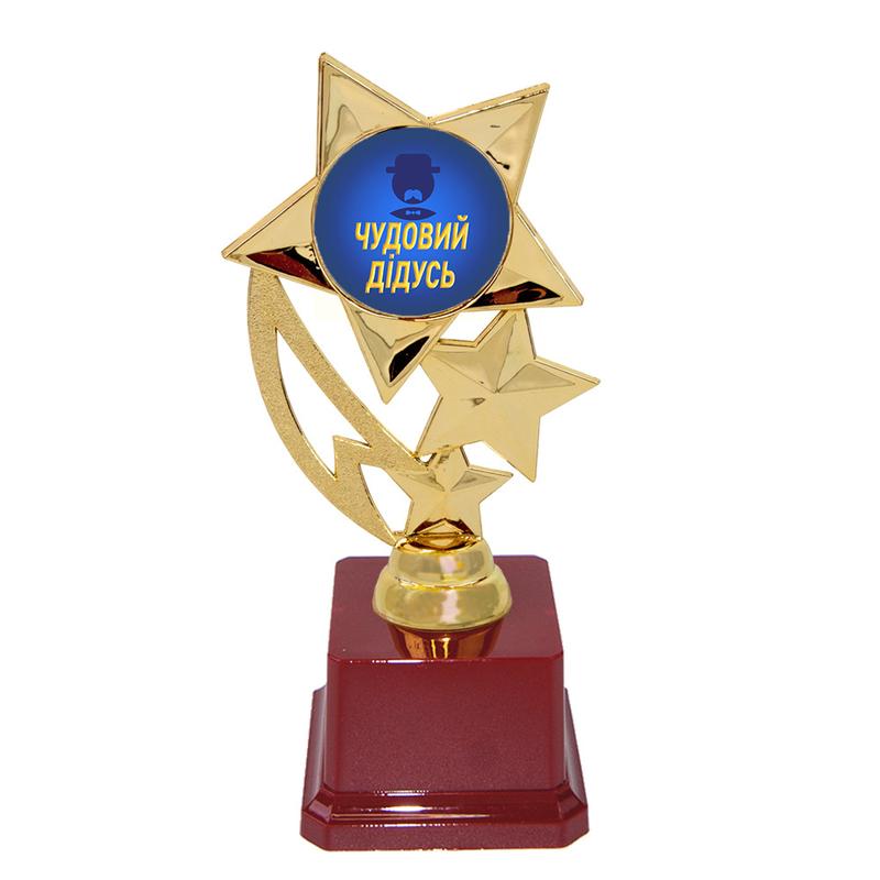 Статуетка 57264 Чудовий дідусь Зірковий політ укр- відмінний та оригінальний сюрприз, який можна подарувати дідусеві на ювілей, на день народження або просто в якості презенту разом з якимось подарунком. Подарунок символічний і незвичайний, який говорить як дорогий для Вас вітається! Статуетка виконана у вигляді 3D композиції людини з медаллю. Фігурка виконана золотим кольором на класичному бордовому п'єдесталі. Статуетка упаковується в індивідуальний тубус з прозорого пластику. Унікальне пакування розроблене компанією Карнавал Приколів. На бордовому п'єдесталі статуетки може бути присутня імітація мармурових розлучень. Оригінальні нагороди та призи в наявності та на замовлення – відмінна ціна. Великий вибір кубків, медалей та нагородних статуеток для будь-якого приводу в інтернет магазині Карнавал Приколів.