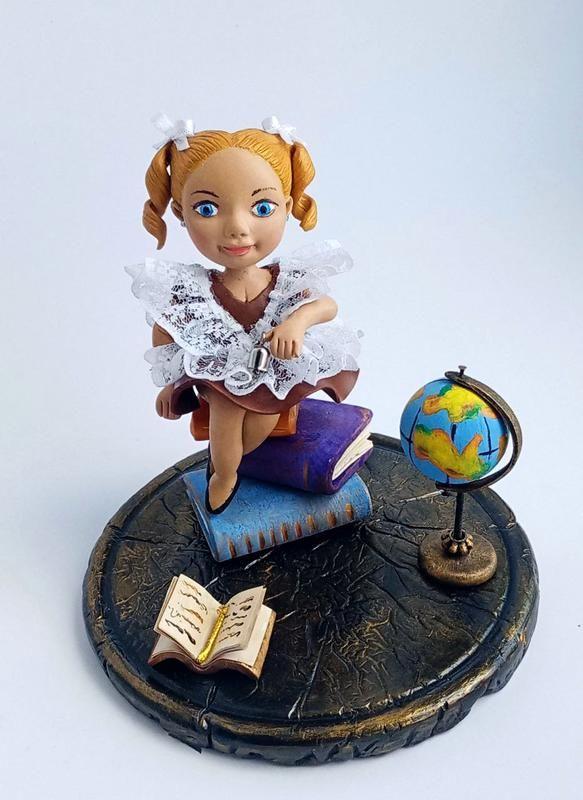 Дівчинка з глобусом та підручниками. Першокласниця з дзвіночком. Виріб із полімерної глини. Розмір 14 на 13 см Чудовий подарунок вчителю :)