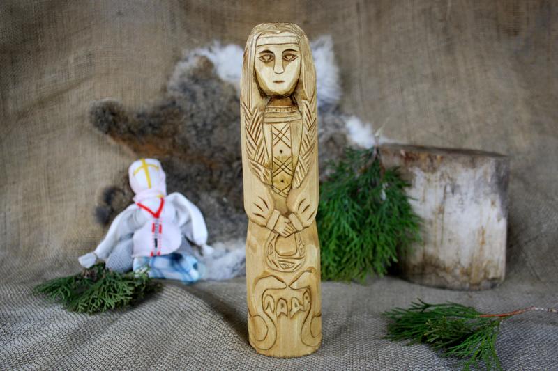 Лада — давньослов'янська богиня любові, злагоди, гармонії, світового порядку і благополуччя. Вона також є богинею весни, кохання і шлюбу, покровителька жіночої вроди і краси, щасливого подружнього життя. Верховна Рожаниця і Берегиня. Архетип Великої Богині-Матері. Характеристика: Висота: 25 см Ширина: 6.5 см Глибина 6.5 см Матеріал: дерево, Обробка: різьблення по дереву, шліфування Покриття: моріння, олією та воском Колір світло коричневий Дивіться також інші вироби