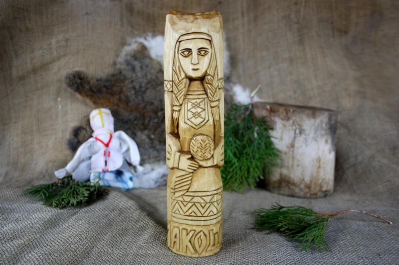 Мокош ― богиня родючості і врожаю, милосердя, долі, шлюбу, покровителька вагітних. Входила до пантеону богів князя Володимира. Мокош ― дружина бога Велеса. Вона опікується прядінням і ткацтвом, а також піклується про домашнє господарство. Характеристика: Висота: 25 см Ширина: 6.5 см Глибина 6.5 см Матеріал: дерево, дуб Обробка: різьблення по дереву, шліфування Покриття: моріння, олією та воском Колір світло коричневий Дивіться також інші вироби