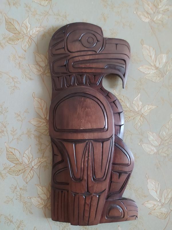Eagle by Larry Joseph Эту скульптуру вручную вырезал мастер-режьбарь Ларри Джозеф, художник со Сквамишей. Каждая резьба является индивидуальной резьбой с ручной подписью художника. Размеры (Ш x В): 20×45 см материал это желтый кедр