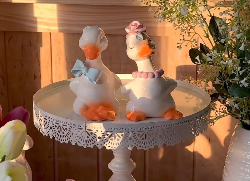 Особливості: набір авторських декоративних білих порцелянових гусенят пара, фарфор ручна робота. Парочка білих весільних гусей порцеляна – він і вона з розмірами – висотою по 14 см. Білий гусак хлопчик розписаний кольоровими підглазурними фарбами з синім бантом, що додає йому витонченого вигляду. Біла гуска дівчинка прикрашена об’ємними рожевими бусами колье та рожевою квіткою трояндою, що надає їй особливого шарму і витонченості. Пару гусей фарфор можна мити, що робить його не лише прекрасним декором, а й практичним елементом для вашого будинку чи дитячої кімнати.