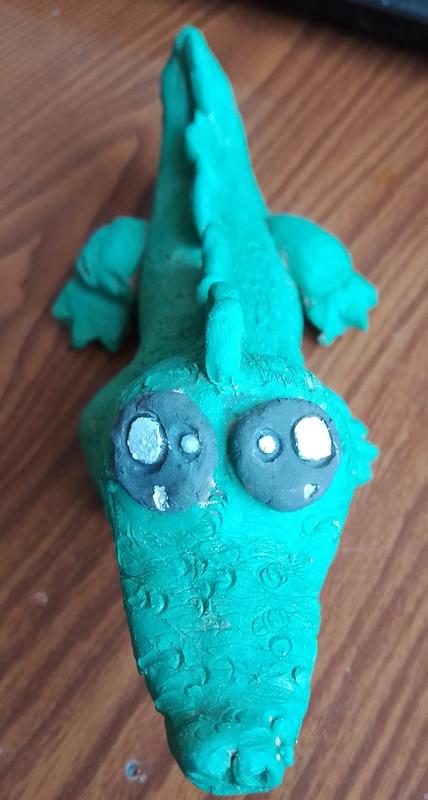 Крокодил зеленого кольору та з чорно білими очима.Розмір у довжину 17,5 см і у ширину 8,0 см з ногами товщина тіла 3,5 см.Ціна договірна