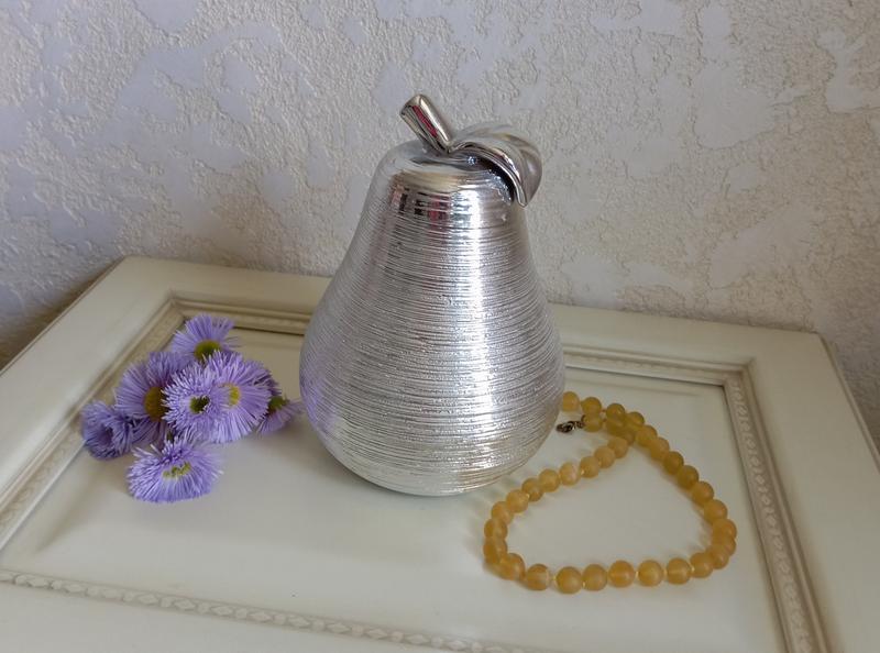 Інтер'єрна Срібна груша. Фарбоване дуте скло. Стан нової. Без нюансів З Німеччини. Висота: 18(18,5) Ширина: 11,5 Основа: 6,5 Товщина виробу: 3(4)
