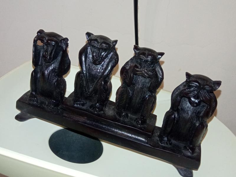 Статуетка чотири мавпи "Нічого не бачу, нічого не чую, нічого не говорю". Ці фігурки часто зображують трьох мавп, але іноді додається четверта, що символізує "не чиню зла" або "не думаю зла". Цей вислів походить з японської філософії і пов'язаний з буддистськими вченнями. Фігурки мавп часто використовуються як обереги або декоративні елементи, що нагадують про важливість мудрості та стриманості. В індуїзмі статуї мавп, зокрема Ханумана, вважаються захисними символами, що відганяють зло.. на вес тяжелая Сделана из дерева, либо полимер, либо древесная смола- точно не пойму. Розміри на фото. Стан ідеальний!