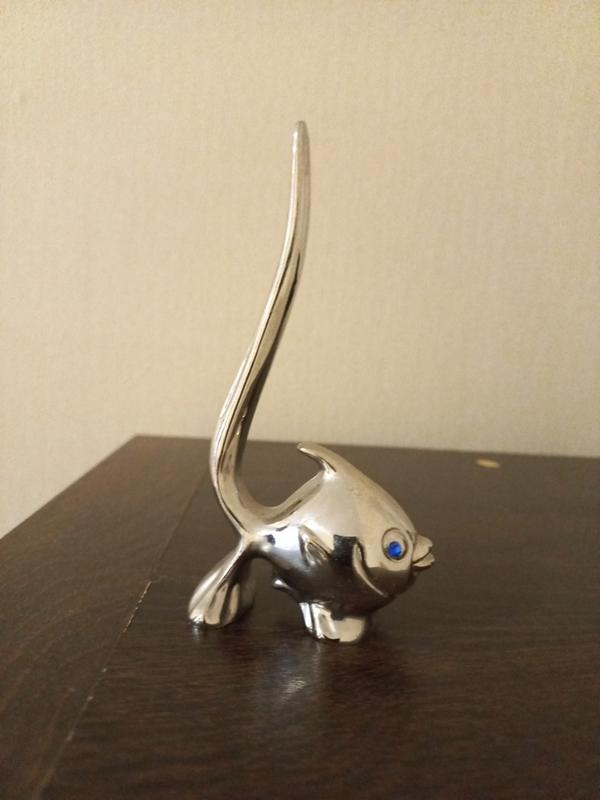 Продаеться підставка для колець та перстнів.У вигляді рибки.Зроблена з білого металу.Очі рибки із синіх камінців