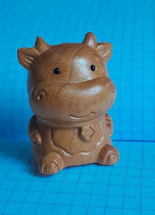 Эта очаровательная миниатюрная статуэтка в виде милого телятка станет отличным дополнением к любой коллекции или уютным элементом декора. Материал: Выполнена из натурального дерева с красивой, теплой текстурой светло-коричневого оттенка. Древесина тщательно обработана, что придает фигурке гладкость и приятного на ощупь ощущения. Дизайн: Статуэтка изображает сидячее телятко с большой головой, выразительными черными глазками и маленьким, милым ротиком, вырезанным в виде улыбки. На груди телятка есть рельефный элемент, похожий на воротничок с медальоном или колокольчиком, что добавляет образу игривости и детализации. Его ушки и рожки аккуратно вырезаны, а лапки сложены впереди. Особенности резки: Четко выраженные линии, которые имитируют детали одежды или украшения на шее телятка. Размеры: Высота: 4.09 см Ширина (по основе): 3.24 см Глубина (от носа до спины): 3.28 см Вес: 18.3 грамма. Благодаря этому небольшому весу фигурка является легкой и компактной, ее удобно размещать на полке, столе или носить с собой как талисман. Назначение: Идеально подходит как: Коллекционная фигурка для любителей милых животных или деревянных изделий. Декоративный элемент для детской комнаты, рабочего стола, гостиной или книжной полки. Подарок на праздники, день рождения или просто как приятный сувенир для друзей и близких. Талисман или оберегает, что символизирует изобилие и благополучие.