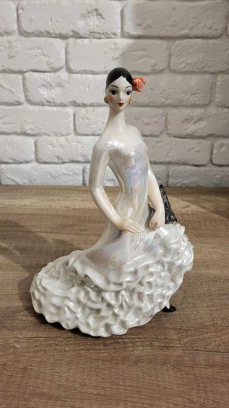 Порцелянова статуетка Кармен "Іспанський танець" Без пошкоджень, в оригінальному стані, без сколів та тріщин, не реставрувалася та не клеїлася. На основі має фабричне тавро Київського порцелянового заводу епохи СРСР. Матеріал: фарфор, надглазурний художній розпис, золочення. Висота: 23 см.