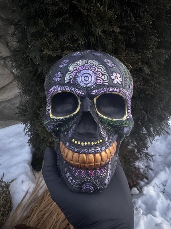 Череп статуетка, оздоблений рельєфно малюнком, у нас таких нема. стильний декор чи для атларя
