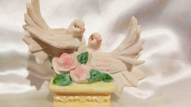Керамічна статуетка пари Голубів. Фігурка воркующих голубков може стати символічним подарунком парі закоханих на день весілля або будь-сімейне свято. Пара білих голубів на підставці. Голубка сидить на букеті квітів. Голуб біля неї, охороняє свою кохану. Розміри: ширина 6 см, довжина 11 см, висота - 8 см