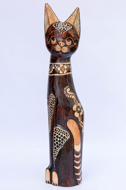 Кот или кошечка,их почитают как хранителей домашнего очага,приносят в дом,благополучие и покой. Кішка розписна ЛЕО,висота 80 див. Матеріал - дерево бальса.Колір - коричневий,з розписом.Країна виробник - Індонезія,ручна робота. За запитом висилаємо фото і відео "в живу". Відправка в день замовлення!