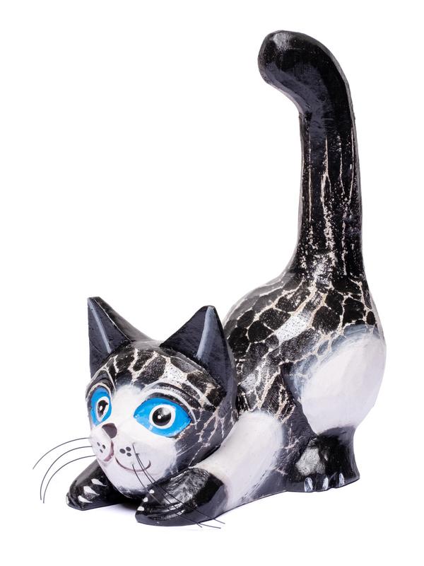Статуетка кіт дерев'яний з блакитними очима вгору хвіст 18 см